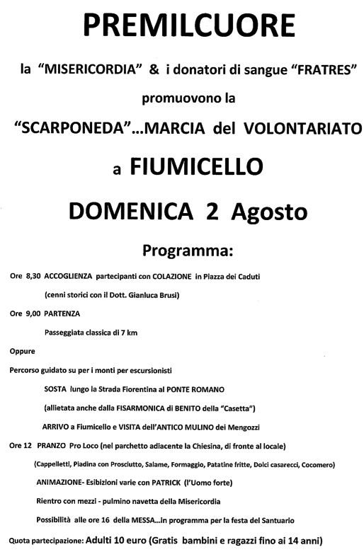 Domenica 2 agosto si terrà la prima marcia del volontariato da Premilcuore a Fiumicello con un bel programma che potete leggere quì sotto nella locandina! Il percorso tradizionale si snoderà lungo il sentiero a fianco del Rabbi fino al ponte romano per poi proseguire su strada provinciale fino a Fiumicello. Per chi lo desidera, un gruppo di volontari misericordia giungerà invece a Fiumicello lungo i sentieri che portano al monte Tiravento-Finestrone-pian di Rocchi, e si potrà aggregare in compagnia! (In questo caso il giro è un po’ più impegnativo e richiede un minimo di allenamento ed abbigliamento idoneo). Info e prenotazioni ai numeri 0543-956540 (centro visite del parco) 339-4888884 (Damiano)