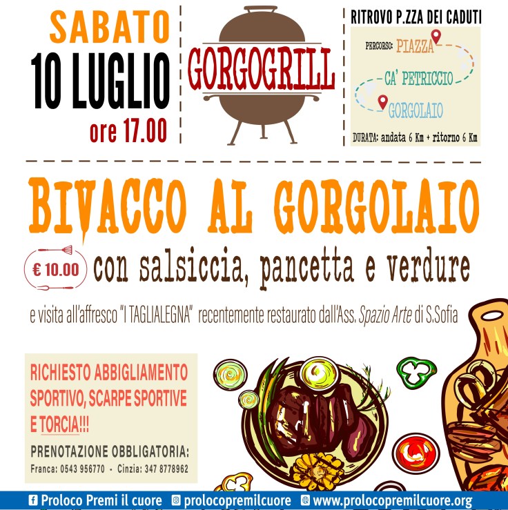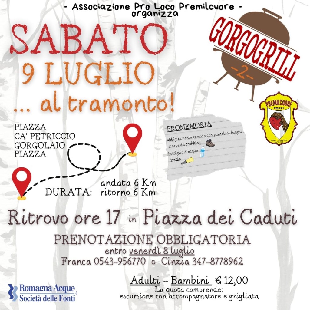 Vi aspettiamo sabato 9 luglio al tramonto per una facile camminata lungo il fiume fino al Gorgolaio dove la Proloco preparerà una gustosa grigliata. Rientro per stesso sentiero con l’ausilio delle torce.