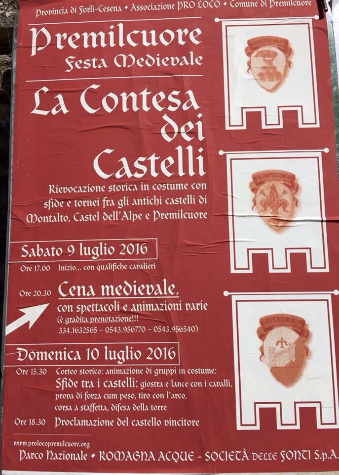 Sabato nove e domenica dieci luglio torna la festa medioevale a Premilcuore! Nella suggestiva cornice di piazza dei caduti si terrà la cena a tema (il sabato sera) allietata da spettacoli e musica, mentre domenica pomeriggio sfilata in costume e sfide tra i castelli di Premilcuore Montalto e Castel dell’Alpe.