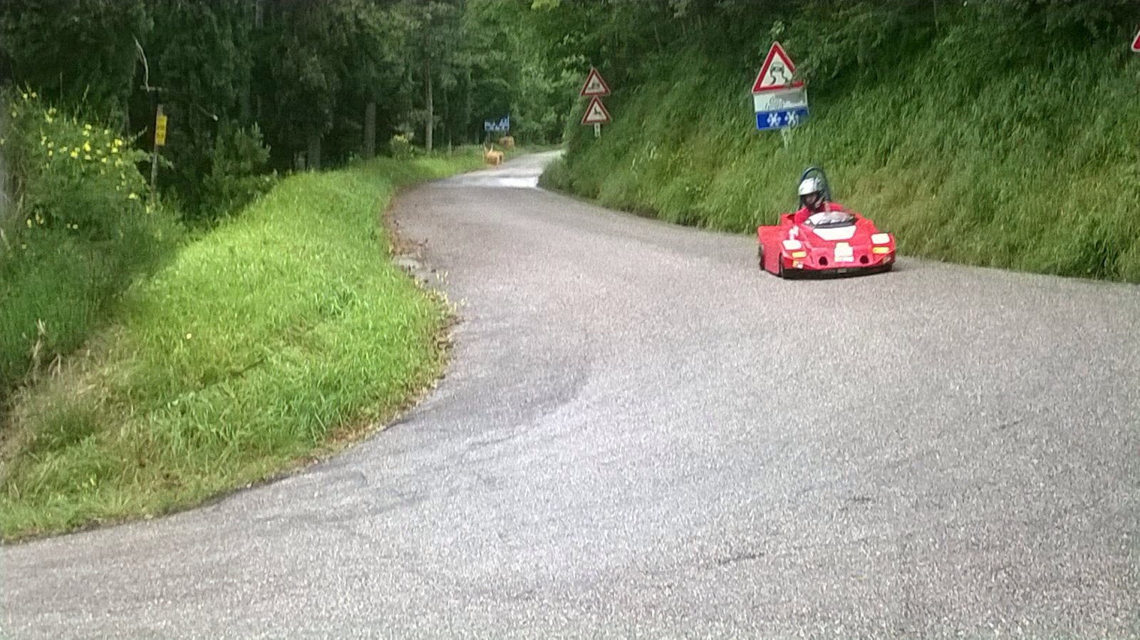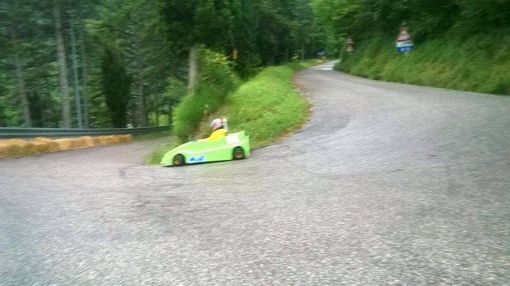 Le discese sono state svolte inizialmente su strada asciutta poi ha cominciato a piovere (a tratti anche forte) così i carioli con ruote gommate hanno montato le gomme da bagnato e svolto la gara… Mentre quelli con le ruote di legno hanno dovuto attendere che smettesse di piovere e si asciugasse di nuovo l’asfalto.