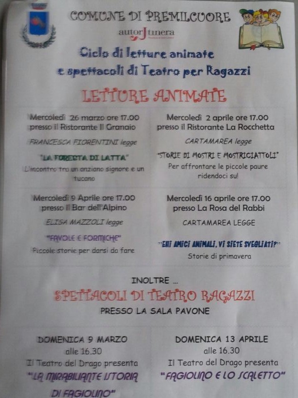 prossimi appuntamenti prossimi appuntamenti organizzati dal comune di Premilcuore, tra letture animate e spettacoli di teatro per ragazzi… in attesa del calendario eventi estate 2014! 9 marzo 2014 0