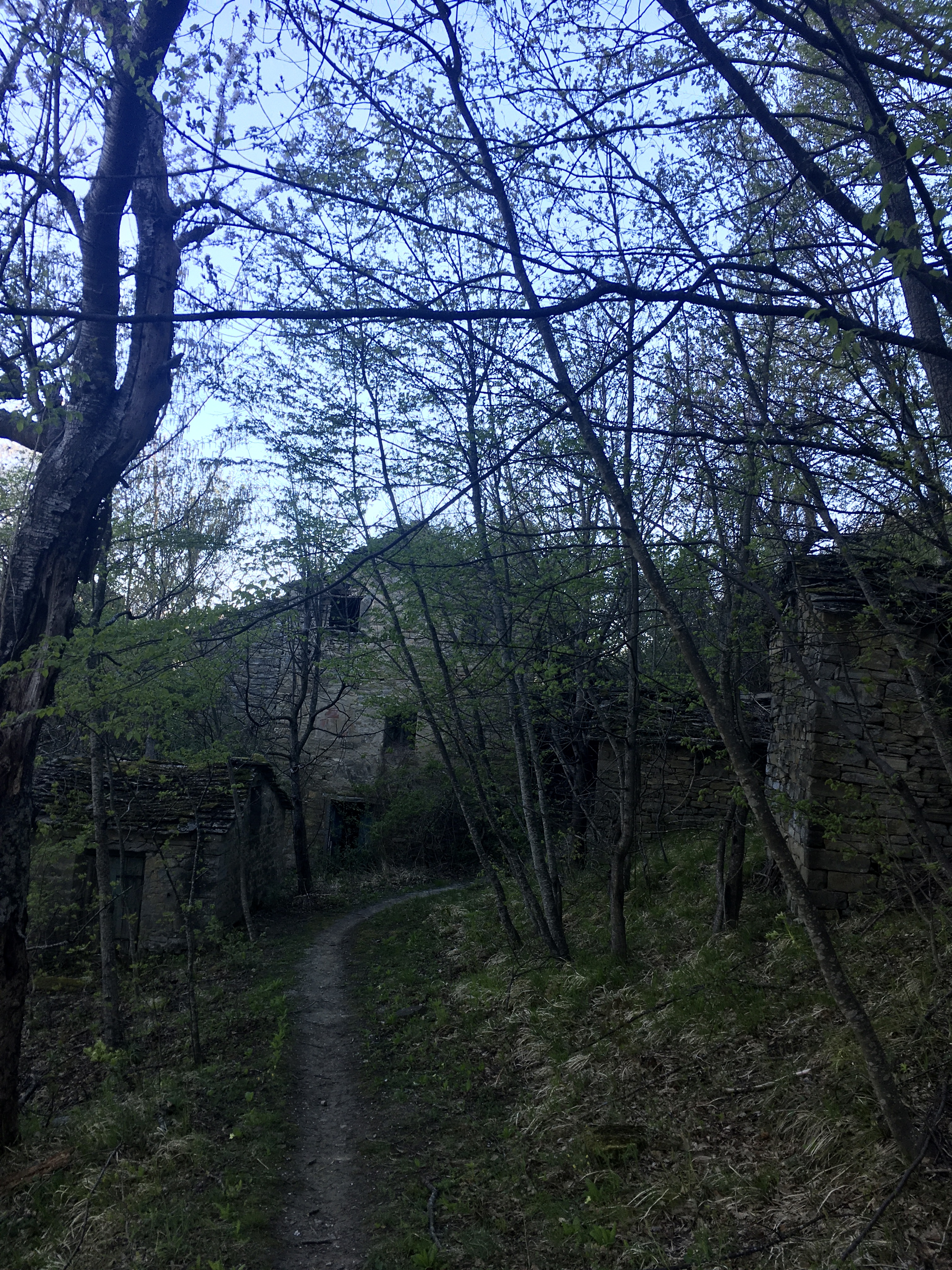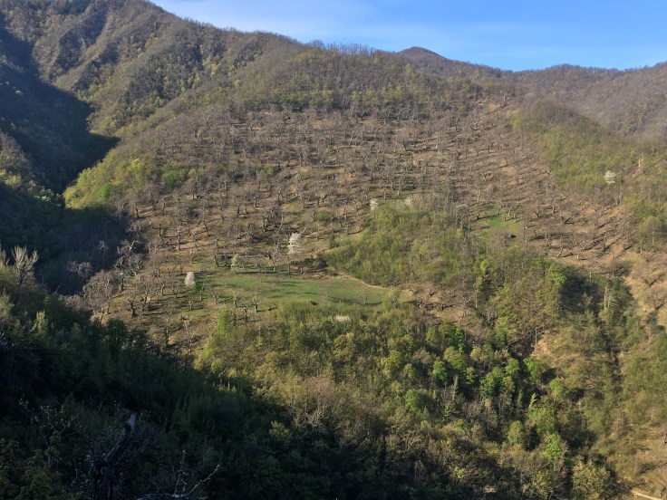 Partenza dal valico Manzo su pista forestale. In prossimità di un capanno di caccia scendiamo sul sentiero 423 alla nostra destra che indica Bocconi. Piacevole discesa tra i vecchi ruderi di cà Fornello e cà Forno arricchito dalla vista sul crinale opposto di uno splendido castagneto.