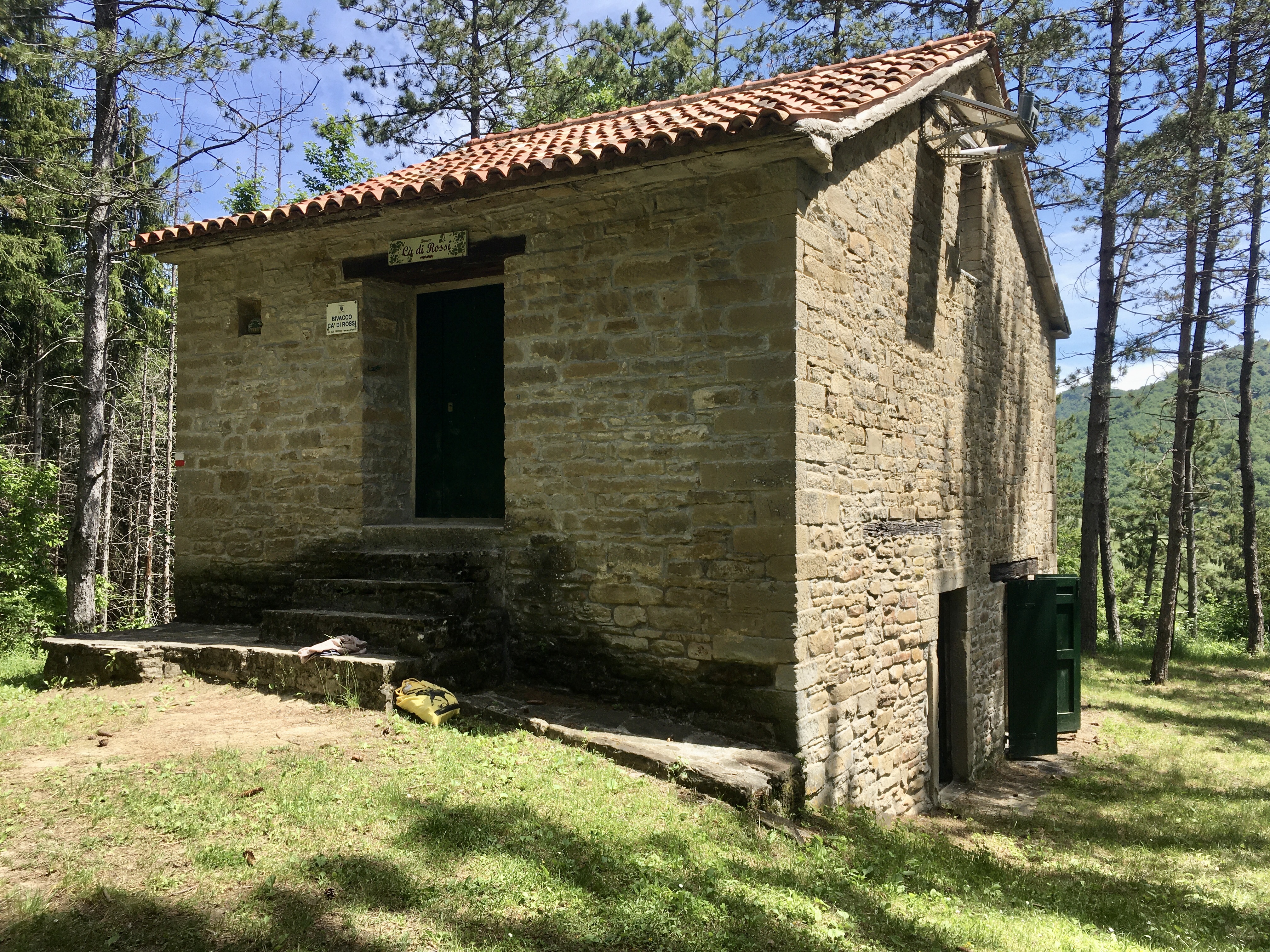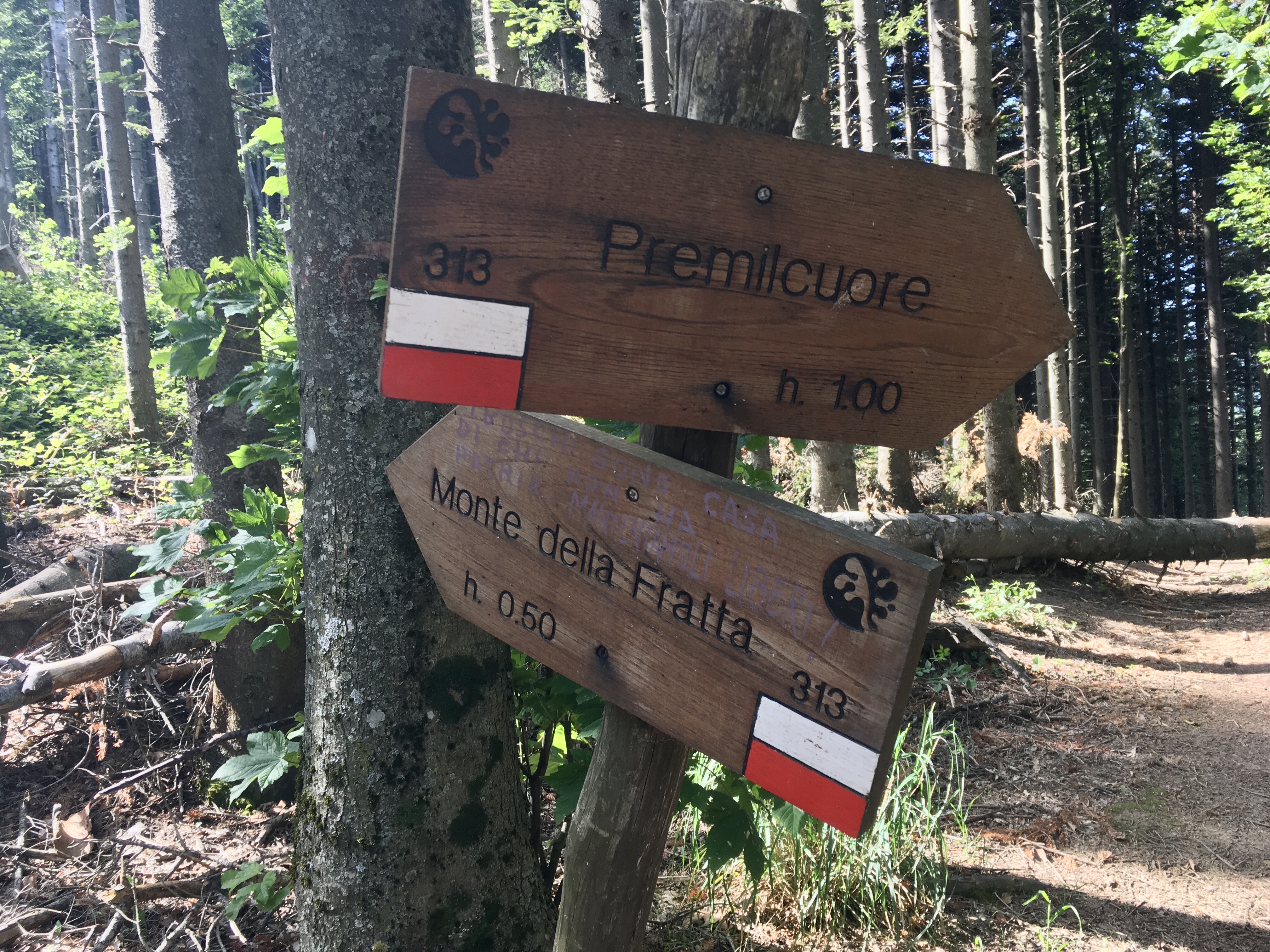 Alla trattoria giriamo a sinistra passando per l’agriturismo antico frutto e saliamo verso Brinatello lungo i campi e qualche metro di strada asfaltata fino a raggiungere la casa del Purgatorio e il valico. Qui se site stanchi potete far rientro a Premilcuore lungo la strada asfaltata che è in genere poco trafficata oppure proseguire per monte Rotondo e la sua croce.